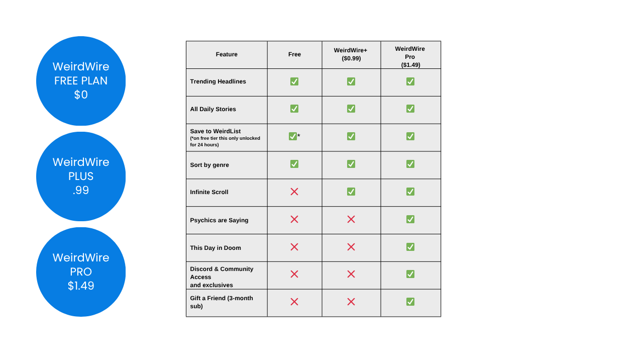 Our app collects the widest range of true weird news from news organization across the globe and combines them into an easy and addictive newsfeed. The newsfeed offers tiered subscription prices.